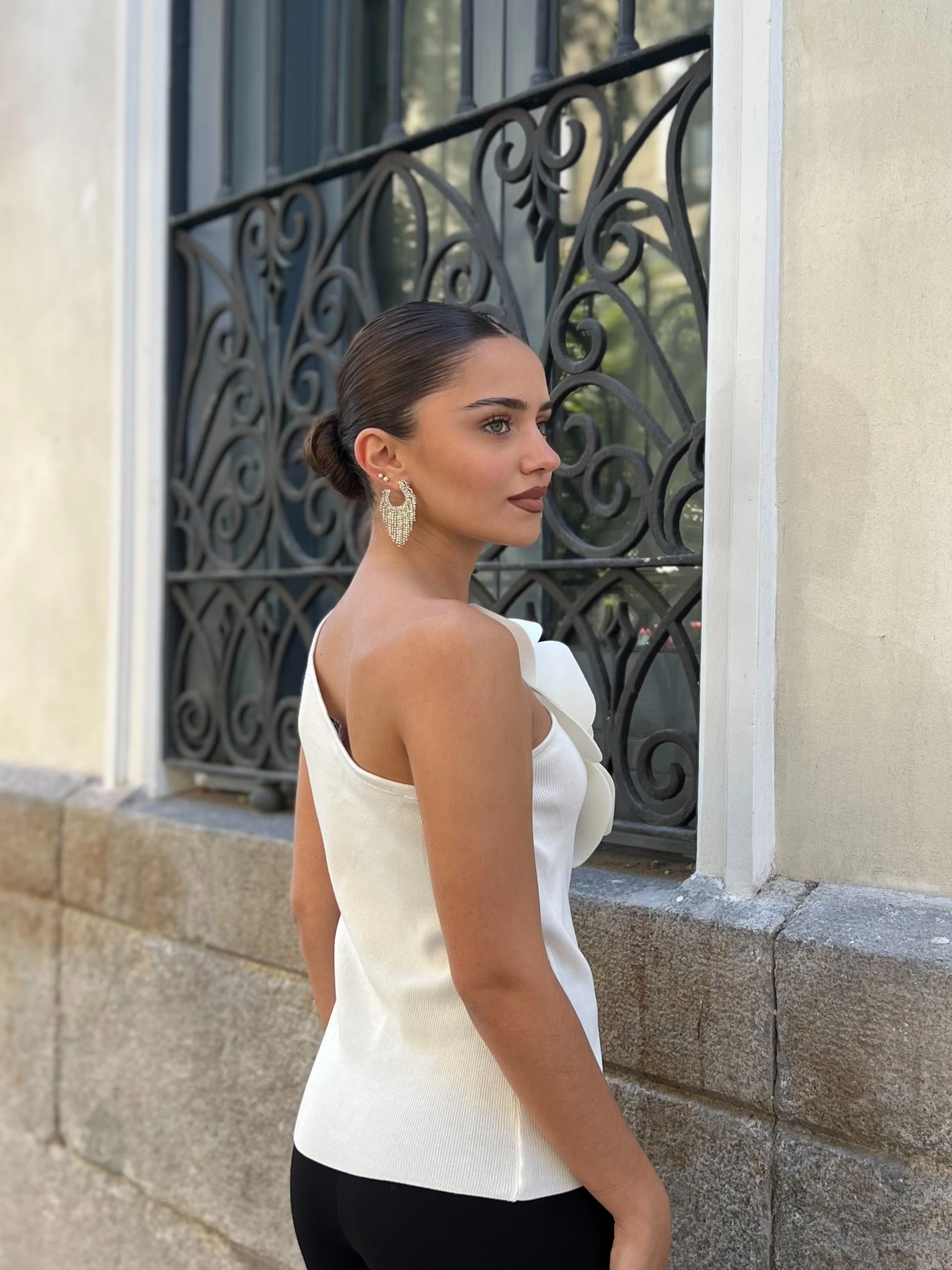 Su silueta realza la figura, mientras que la flor aporta un aire sofisticado, artístico y lleno de personalidad. Un top pensado para quienes buscan destacar con un estilo único y femenino.